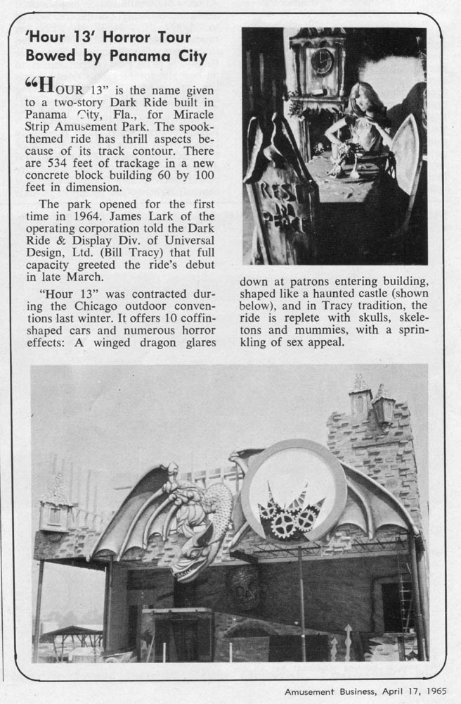One of the unanswered quickfacts has finally been answered and validated by an article and an advertisement. Bill Tracy did design and install dark rides under another company’s name. Universal Design Limited, located in Wildwood, NJ, was known for their monorails and sky towers. UDL, as strange is it may seem, also had a Dark Ride & Display Division. Tracy was the head of this division and built rides under their name from approximately 1964 to 1967. Here is a full-page ad for UDL that appeared on the back cover of the May 6, 1967 issue of Amusement Business. Note: Dark Rides is listed at the bottom as one of the rides and attractions that they design and manufacture. Hour 13, a two-story dark ride at Miracle Strip Amusement Park, opened in 1965 and was one of the dark rides that Tracy built under UDL. Enjoy viewing an article about Hour 13 that appeared in the April 17, 1965 issue of Amusement Business. Note: Bill Tracy is directly associated with Universal Design Limited in this article. Special thanks again to Rick Davis with dafe.org for sharing the article about Hour 13 with us.