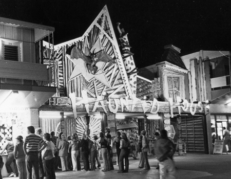 We are happy to release a full-frontal view of the Haunted House at Trimper’s Amusements in Ocean City, Maryland from the 1970s era before the second-story addition was finished thanks to the Ocean City Life-saving Station Museum website. You will notice that there is no ticket booth, no second story fence, shorter façade roofline, and additional columns near the front of the building (which are actually located near the back of the lobby today). Eat your hearts out; this is true Bill Tracy style!