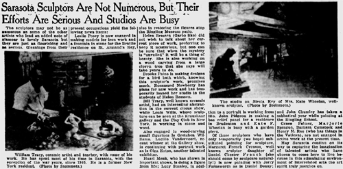 Check out an article from the March 1, 1950 issue of the Sarasota Herald-Tribune where Bill Tracy is featured in a photo with some of his ceramic sculptures (left). For more on Tracy’s sculpturing endeavors, read the Early Years section of the biography. Click image to enlarge.