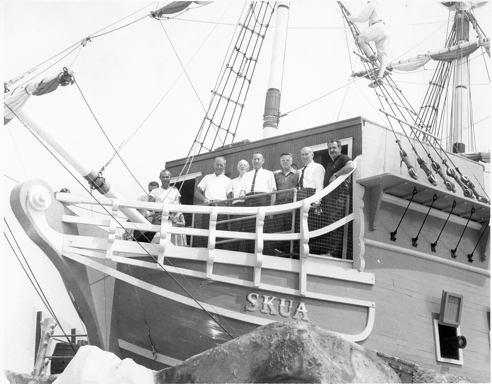 Thanks to Al Alven, a Wildwood historian and enthusiast, we are pleased to release the full photo showing Bill Tracy standing on the deck of Pirate Ship “Skua”. This photo was taken around the opening of “Skua” and shows Tracy standing at the far right wearing a dark colored shirt. “Skua”, a walk-thru attraction at Hunt’s Pier, opened in 1962 and unfortunately closed in 1989. Click photo to enlarge and enjoy!