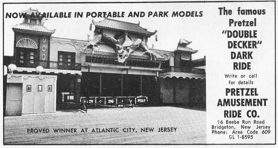 Pretzel Amusement Ride Co. placed this advertisement in the March 21, 1964 issue of Amusement Business and featured the Orient Express at Million Dollar Pier in Atlantic City, NJ. Tracy was responsible for the unique facade of this double-decker dark ride and Pretzel executed the gravity-powered ride system. Tracy’s facades were often featured in Pretzel advertisements.