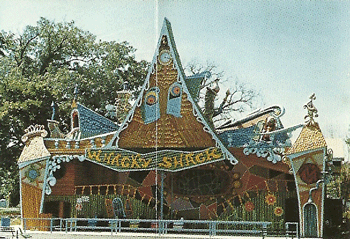 We are pleased to finally release a photo of Whacky Shack at Joyland Amusement Park in Wichita, KS as it looked before the dip was removed! This Whacky Shack opened in 1974 and is known as Tracy’s final project before he passed away in August of the same year. Note: The random and colorful “stained glass” pattern and large opening above the dip is very similar to what was constructed five years later for the Tracy inspired Lumalusion.
