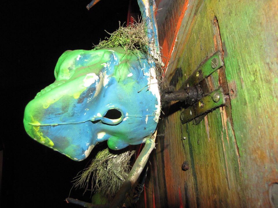 Granville Trimper built The Haunted House in Ocean City, Maryland alongside the dark ride master of the era, Bill Tracy, in early 1964. Records show Tracy was on location in Ocean City with his crew for two weeks back then to install the ride and get it running. One of the original stunts in the attraction can be seen in the first room, titled “Spider Staircase” by Tracy, and is comprised of some animated skull spiders spooking out on a dilapidated banister facer wall. A cool fun fact about the 59 year old stunt, measuring 12 feet long and 8 feet high, is that Tracy used store-bought plastic skulls to make the spook work. Back in the 60’s, Halloween decorations were much less sophisticated than they are today, but the “Skull on a Spike” was popular back then and families loved to display them in their yards. It’s clear Mr. Tracy used a few of those for the stunt based on the molded form underneath. Little did Tracy know that those store-bought plastic skulls would still be dancing in 2023. –Brandon