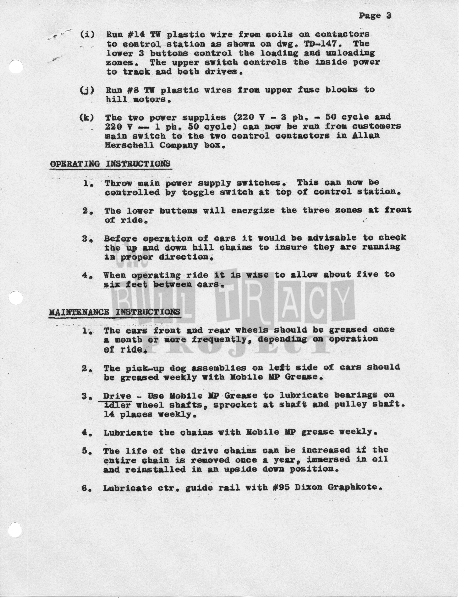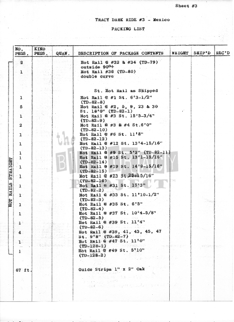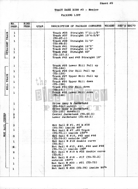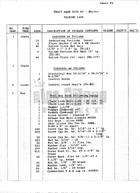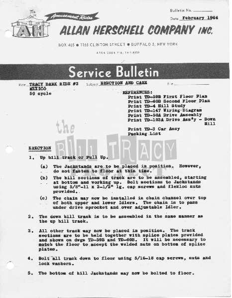 We know Tracy’s Scary House at Chapultepec Park in Mexico City opened in 1964 and supposedly closed in 1994. It was a two-story package dark ride and Allan Herschell Company Inc. supplied the ride system which contained 10 ride cars. The uphill section of track used a chain and drive assembly that assisted the cars to the second floor, and the downhill section of track also used a similar chain and drive assembly that assisted the cars back down to the first floor. In the Allan Herschell service bulletin and packing list below, they referred to the ride as “TRACY DARK RIDE #3 – MEXICO.” It’s clear that the ride cars are the same units used at West View Park’s Haunted House and Whacky Shack at Hunt’s Pier. Check out the original Allan Herschell Company documents below, both sets of which were critical pieces in the installation of one of Tracy’s earlier dark rides.