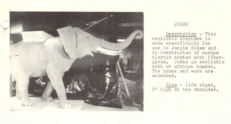 Tracy and his team fabricated many large elephant stunts back in the day, most of which were used in his Jungle Land and Lost River rides and often towered over ten feet. While some “Jumbos,” as Tracy called them, were used for interior décor, most were built for outdoor and wet conditions as they were made with Celastic, a lightweight, unbreakable, and weatherproof fabric that he utilized previously to build his props while working at Ringling Bros. and Barnum & Bailey Circus. Check out a photo of his secretary, Cornelia Couch, checking out one of his creations circa 1962, and a few other relics.