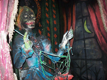 Bill Tracy’s company contained an office staff, stunt and prop fabricators, set artists, carpenters, mechanics, electricians, installers, laborers, and truck drivers. Bill himself spent much of his time traveling and many of his employees rarely interacted with the master himself. The props and figures used in the stunts were either made from molds or from scratch. Some of the materials used to produce the props and figures were Celastic, fiberglass, and washable marine plastic, all of which were moisture retardant and flame resistant. The inner skeleton of the figures consisted of wood, metal, and chicken wire. Some of the props and stunts were mass-produced and others were custom built for a particular ride and never recreated. These props and stunts were usually fabricated at the workshop and shipped to the project site, but sometimes items were fabricated on-site as needed. Bill definitely had his own personal list of favorite props and figures that he liked to use regularly. Some of his favorites included bats, buzzards, rats, spiders, drunken skeleton pirates, and provocatively dressed women. Bill was also creative in using existing materials from the local area to add to the realism of a scene. For instance, he has been known to use old wood from an abandoned building for a project, instead of trying to weather a new piece to make it look old.