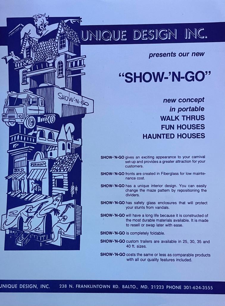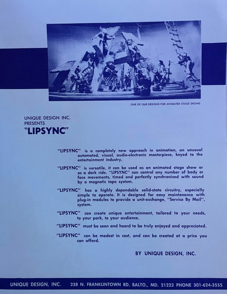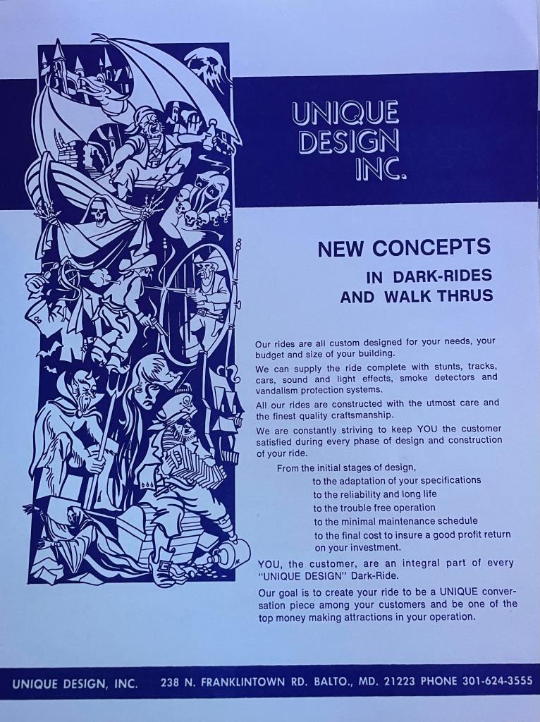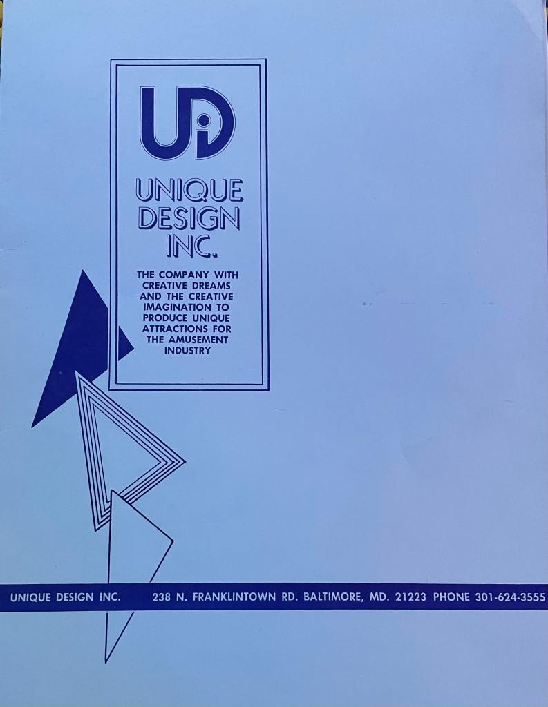 Unique Design, Inc. was founded in 1969 by Edward D. Hilbert and was based in Baltimore, Maryland. The company specialized in producing decorative scenery and stunts for the amusement park industry, most notably dark rides and themed attractions. UD was known in the industry for its skilled craftsman, sculptors, and graphic artists and was thought highly of by many of the East Coast’s largest amusement parks. One of the company’s most well-known jobs was the re-theming of Kennywood’s Old Mill in 1974.