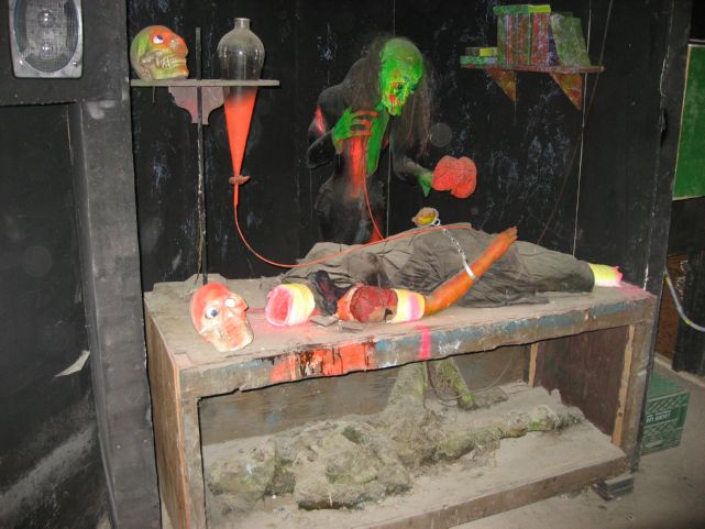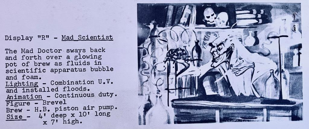 Tracy’s Mad Scientist stunt (aka Mad Doctor or sometimes Bartender through the years) was a staple in his attractions through the 60s. The stunt often featured a haggard figure that swayed front to back electronically with various iterations of painted scientific scenery surrounding him. In a few installations, the figure would sway over a glowing pot of brew with bubbles and foam, but for the majority, he’d simply animate while holding a skull with scientific instruments nearby. Most installation dimensions varied but were commonly at least 10’ long, 7’ tall, and 4’ deep. Some installations with smaller footprints featured dimensions as small as 3’ X 3’ X 4’. Flood lights often set the mood to make the figure, props, and backdrop glow. Many popular attractions featured Tracy’s Mad Scientist, such as The Haunted House at West View Park in PA, Ghost Ship at Ocean Playland in MD and later The Haunted House at Trimper’s Amusements in MD, Whacky Shack at Hunt’s Pier in NJ, and Castle of Terror at Rocky Point Park in RI. Very few remnants of this stunt exist today, save for those in private collections or in storage. As many Tracy fans will attest, the Mad Scientist will always be regarded as one of Tracy’s greatest hits during the early part of his dark ride career.